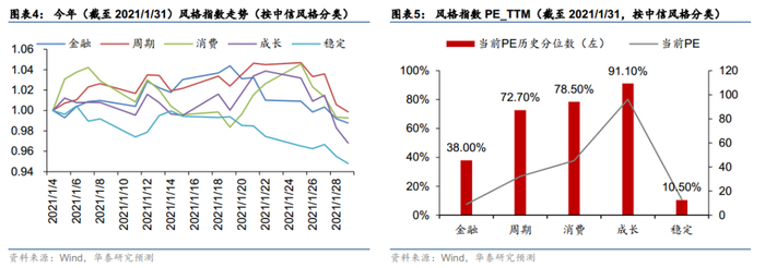 今年以来,周期风格指数涨幅领先,稳定股表现较弱。消费股的PE_TTM分位已高于自2013年以来90%的历史高位,周期股的PE_TTM分位仍有上涨空间,目前为自2013年以来72%的历史高位。