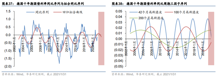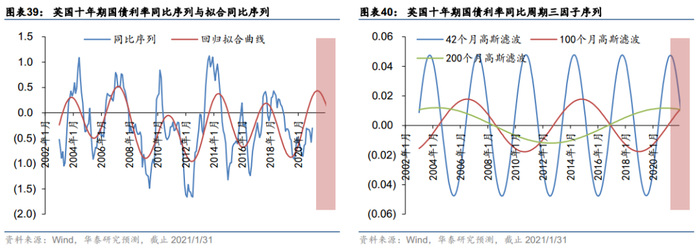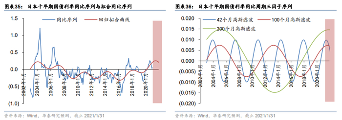 我们首先对中国、美国、日本、德国和英国十年期国债利率的月度数据进行12期差分处理,并处于统一表述的目的将其定义为利率的同比序列,随后对此同比序列进行三周期分解,发现各国利率当前多处于短周期上行接近顶部、中周期上行、长周期处于顶部区域的周期状态。