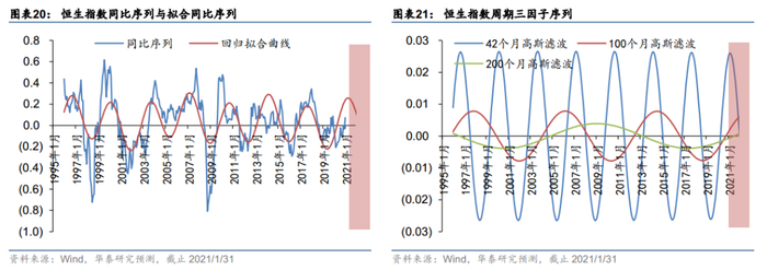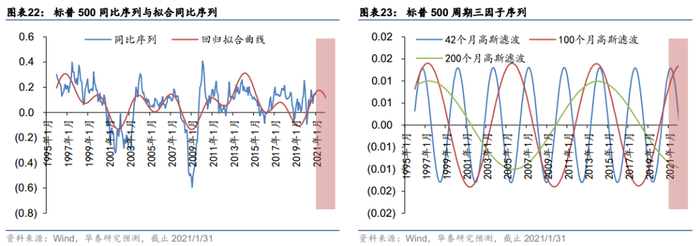 在2017年5月9日发布的《金融经济系统周期的确定》以及2017年8月19日发布的《周期三因子定价与资产配置模型》等华泰金工周期系列报告中,我们发现全球宏观经济和资产价格数据中,普遍存在42个月左右、100个月左右和200个月左右的三个周期。这三个周期作为经济波动变化中能量占比高且稳定的成分,能解释经济金融系统中绝大部分变量的运动规律,我们依此构建华泰金工周期三因子模型,对各类资产价格的对数同比序列进行滤波分解,并将周期滤波外推进行预测。