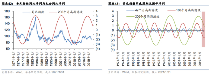 对美元指数进行三周期分解后,我们发现美元指数走势受长周期影响最大,200个月的长周期决定了美元指数长期运行方向;100个月和42个月的短周期决定了美元指数中短期次级趋势。当前美元指数短、中、长三周期共振下行,美元指数未来或呈现出下行趋势。
