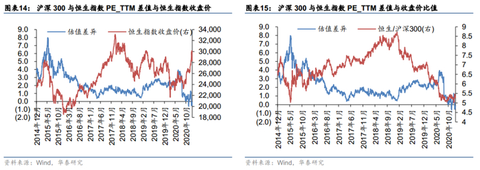 我们将AH股的估值差异与恒生指数以及恒生指数相对沪深300的表现进行对比观察。其中恒生指数相对沪深300的表现我们采用恒生指数收盘价除以沪深300的收盘价来刻画,当该比值上升,说明恒生指数相对更优,反之则是沪深300表现更优。