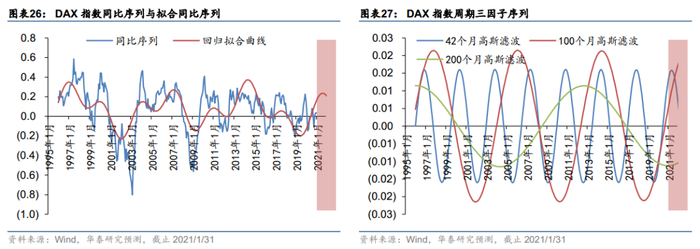 我们首先对上证指数、恒生指数、标普500和DAX指数等主要股指进行三周期分解,发现全球股指当前多处于短周期上行接近顶部、中周期上行的周期状态。历轮基钦周期实际市场涨跌时长不对称,平均而言上升阶段更长。具体可以参看年度策略《2021全球主要市场量化资产配置年度观点》(20210119)和《2021中国市场量化配置年度观点》(20210201)。
