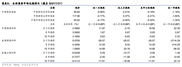 近一月(截至2021/1/31)中国国债利率上行。美国3个月短期限国债利率下跌超过28BP,中长期国债利率上行。欧盟中长期公债利率下行。中国中债新综合、国债和信用债净价指数总体保持平稳。
