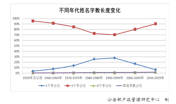 14、四字及其他字数姓名虽使用人数较少,但一直保持增长态势,分别由上世纪五十年代的0.3%、0.4%提高到目前的1.6%和1.7%。