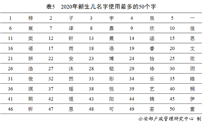 15、2020年出生并已经进行户籍登记的新生儿名字中,使用频率最高的50个字依次为“梓”“子”“宇”“辰”“一”等。