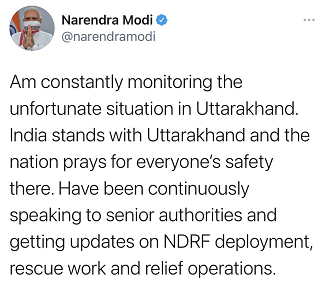 印度总理莫迪当日发推称:“我在监测北阿坎德邦北阿肯德邦的不幸情况,为那里的每个人祈祷。”