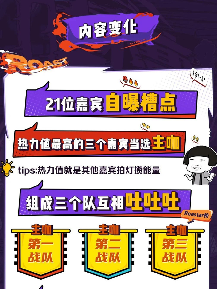 其三,每一期被吐槽的主咖,可以在队里挑选一名“补刀选手”,吐槽场上所有对手,替主咖反击。如果补刀选手是全场最高,那么队长的得票数就可以翻倍,如果补刀选手的得票非全场最高,那他就是白来一趟。