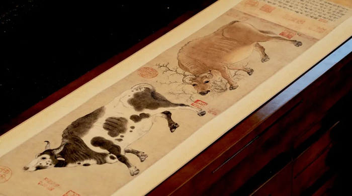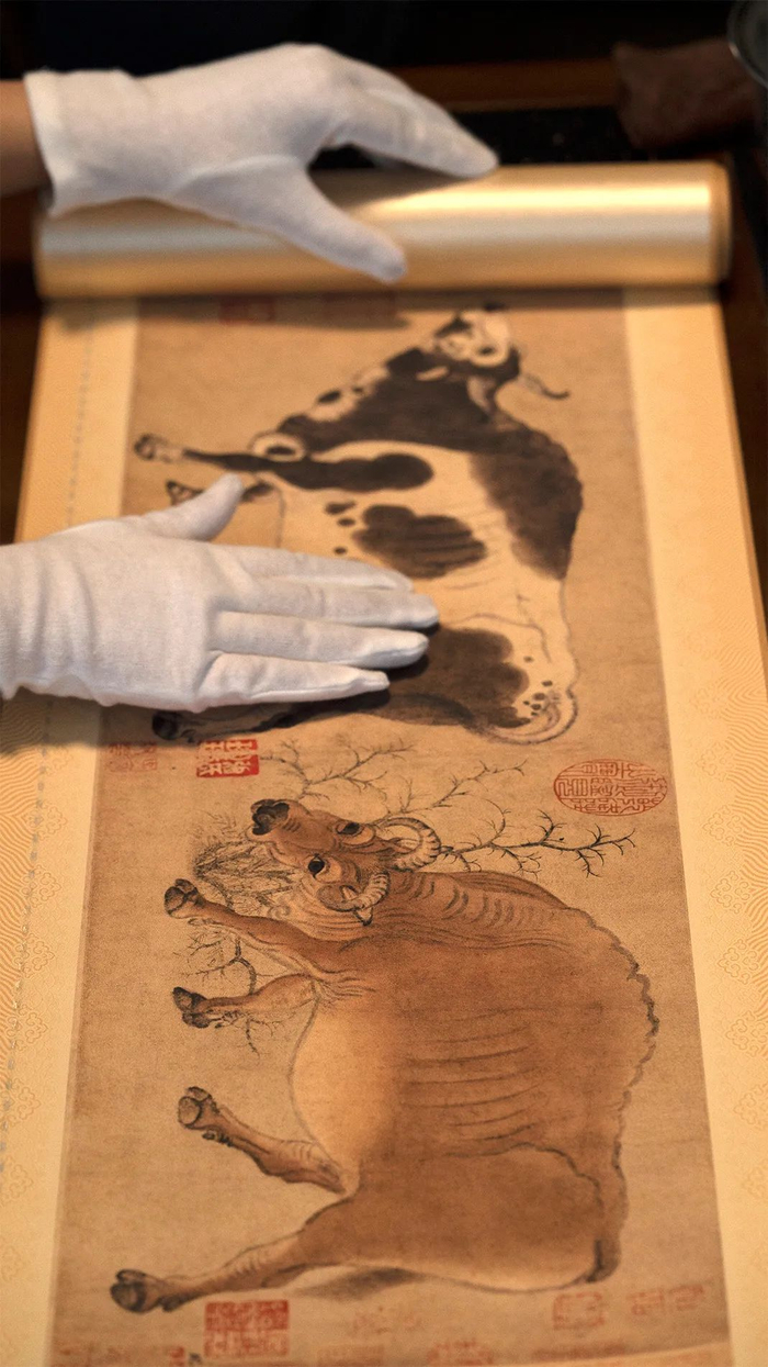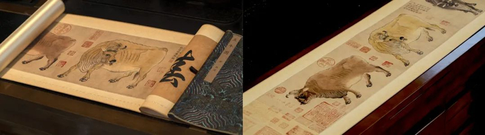 为了更好地保护画作,两组《五牛图》复刻画作均特地采用了丝绢装裱。