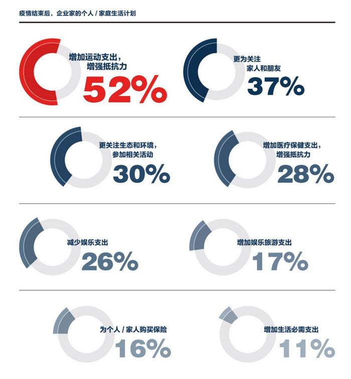 此次疫情对高净值人群影响最大的是健康意识的提升。数据显示,近八成高净值人群认为健康是人生重要目标,且近六成将健康排在人生目标重要性的第一位。报告认为,健康管理将会是疫情后高净值人群家庭生活的重中之重。超过半数高净值人群计划“增加运动支出”,约三成计划“增加医疗保健支出”,16%的企业家计划“为个人/家人购买保险”。