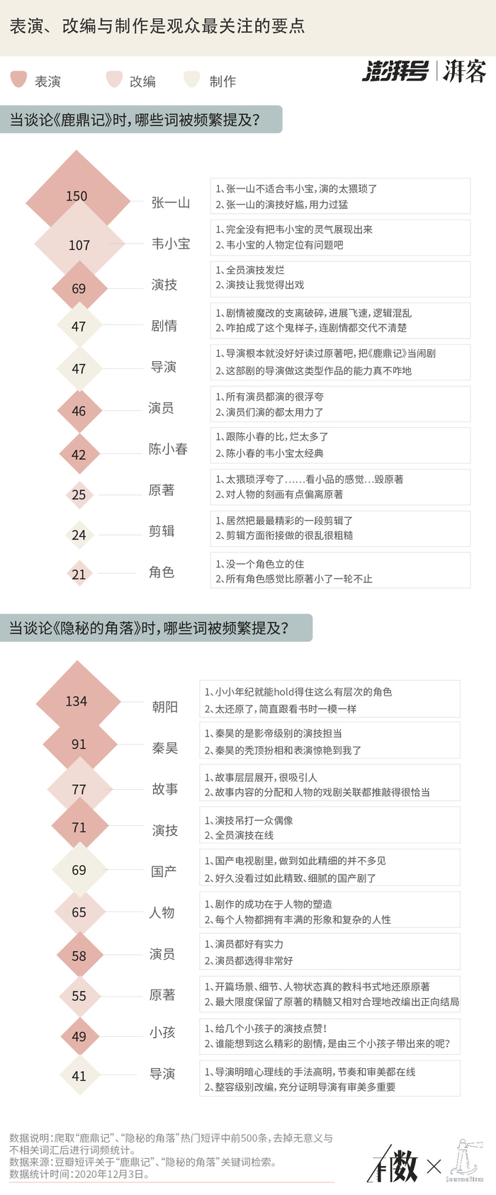 表演、改编与制作,始终是观众们关心的要点。作为剧目最直观的呈现,演员的表演决定着观众一眼之后是否会继续看下去。在对《隐秘的角落》的评价中,饰演朱朝阳的荣梓杉与饰演张东升的秦昊演技均被大加赞赏;而张一山在《鹿鼎记》中的表演则被批评为“尬”“猥琐”。