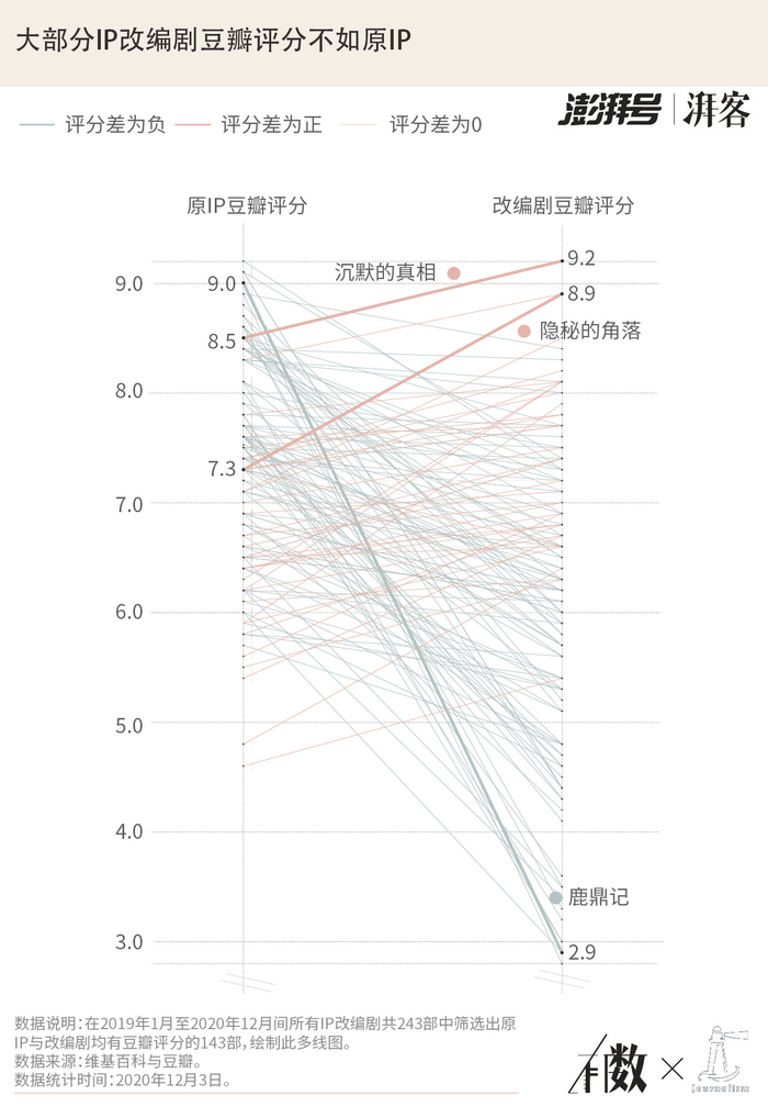 与此同时,受众范围广泛的大爆剧由于原作质量高、剧集打分人数多等等原因,改编分数很难得到飞升,如《都挺好》《长安十二时辰》《鬓边不是海棠红》《庆余年》等作品,都是改编分数比原作小范围内略有升降。今年,《隐秘的角落》突出重围,在82万人的评价下保持了8.9的高分,比原作高出1.6分。《沉默的真相》也在原作8.5的高分基础上提到9.2分,在241部IP剧中独占鳌头。不过,这样的佼佼者始终只是少数。