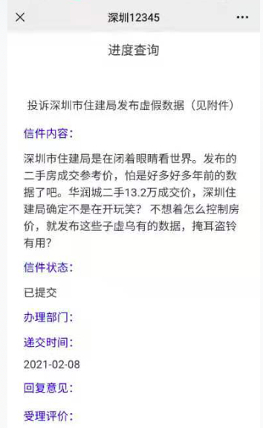 针对这一数据差异,在政策发布不久,有网友爆料称已有购房者向深圳12345投诉了深圳市住建局。