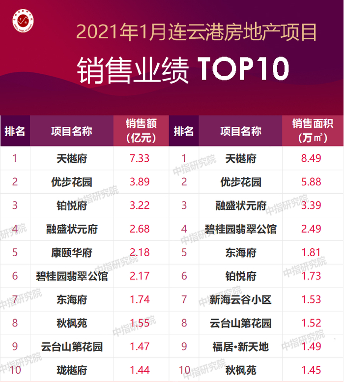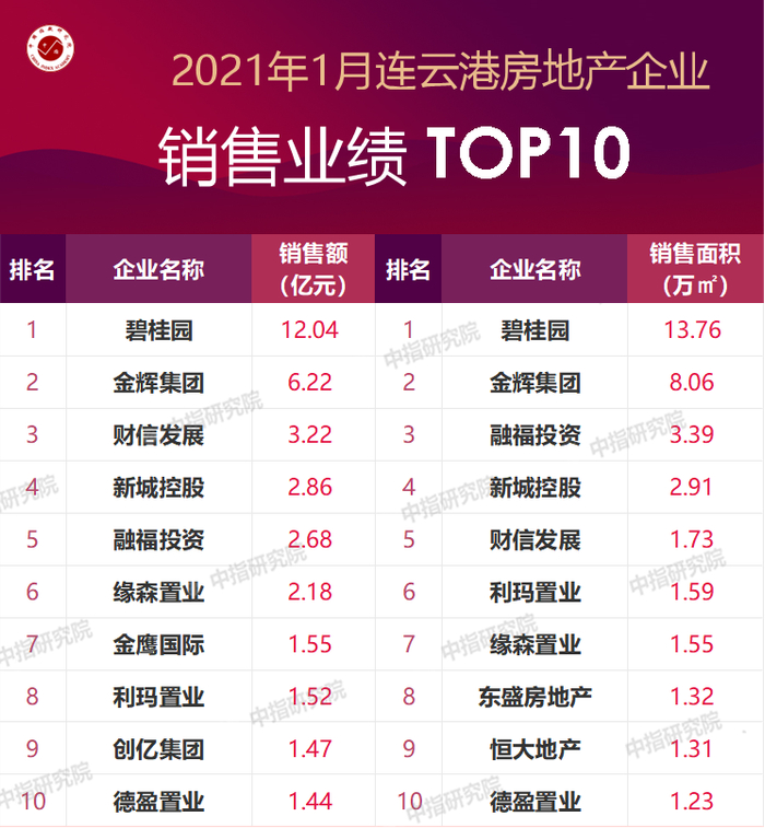 特别声明:房地产企业销售数据统计是以2021年1月1日-1月31日期间销售的商品房为统计口径,包括商品住宅、写字楼、公寓、商业全口径,主要依据CREIS中指数据在连云港市域范围的销售监测数据,并参考企业提供的相关数据,经课题组严格审核纳入统计。本报告仅供参考,课题组不对使用报告及其内容所引发的任何直接或间接损失承担责任。