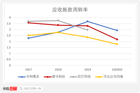 与同行业公司相比,2019年起中科微至的应收账款周转效率高于德马科技、欣巴科技和行业均值。