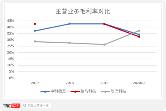 可比公司之间的主营业务毛利率对比之下,中科微至与德马科技的毛利率更接近。欣巴科技的业务范畴为方案设计和软件开发等,缺乏设备生产环节,毛利率偏低。