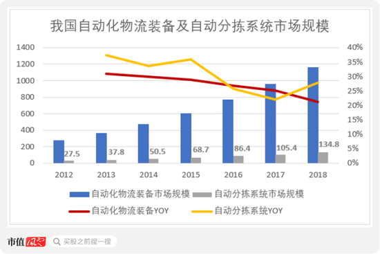 2018年,我国自动化物流装备市场规模为1160亿元。其中,自动分拣系统市场规模为134.8亿元,在自动化物流装备中占比11.62%。