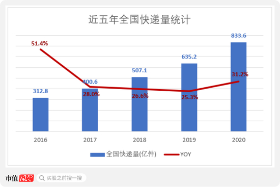 而国家邮政局数据显示,2016年~2020年全国的快递量也从312.8亿件快速增长至833.6亿件。