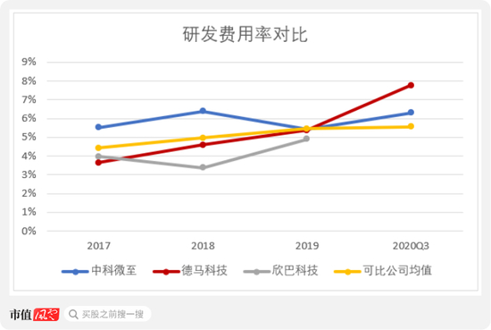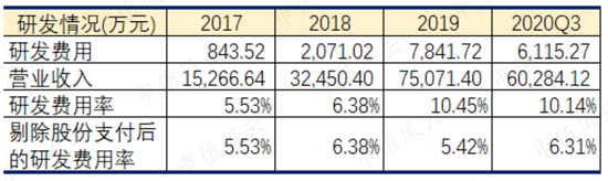 2017年~2020年9月,中科微至每年投入5%以上的收入来进行研发,并在各期将研发投入费用化,会计处理上较为谨慎。2019年起,因实施了股权激励计划,中科微至的研发费用率一度突破10%。