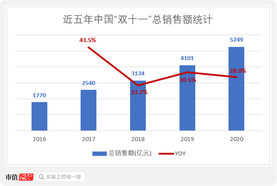 近五年来,双十一全网成交额从1,770亿元增长至5,249亿元。2020年,仅天猫双十一当日的实时物流订单就多达23.32亿单,相当于2010年全国快递量之和。