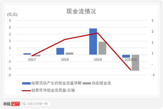 现金流量表指标中,受大量提前备货影响,中科微至2020年前三季度的经营性净现金流量由正转负,经营性净现金流质量(净现比)下降。