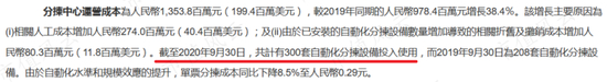 公开财报显示,2017年末、2018年末、2019年末和2020年9月末,中通分别共计有58套、120套、265套和300套自动化分拣设备投入使用,单票分拣成本因此从0.39元下降至0.29元。