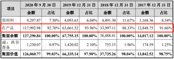 2017年末、2018年末、2019年末、2020年9月末,中科微至的存货在公司总资产中的比重分别是44.54%、59.22%、51.64%和60.05%,是中科微至最大的资产科目。