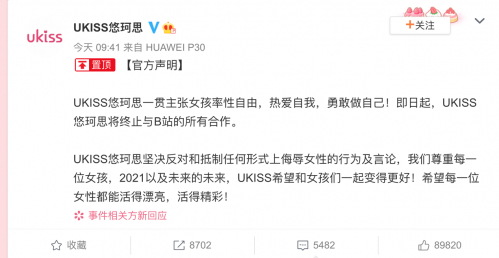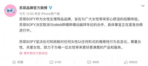 苏菲品牌官方微博表示,苏菲SOFY决定取消与bilibili哔哩哔哩动画拜年纪的合作,具体事宜正在紧急协商进行中。苏菲强调,苏菲SOFY坚决反对和抵制对任何女性以任何形式的侮辱性行为及言论。