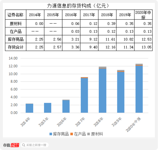 力源信息的年报、半年报披露,库存商品占存货中的比重非常高,基本在95%以上。