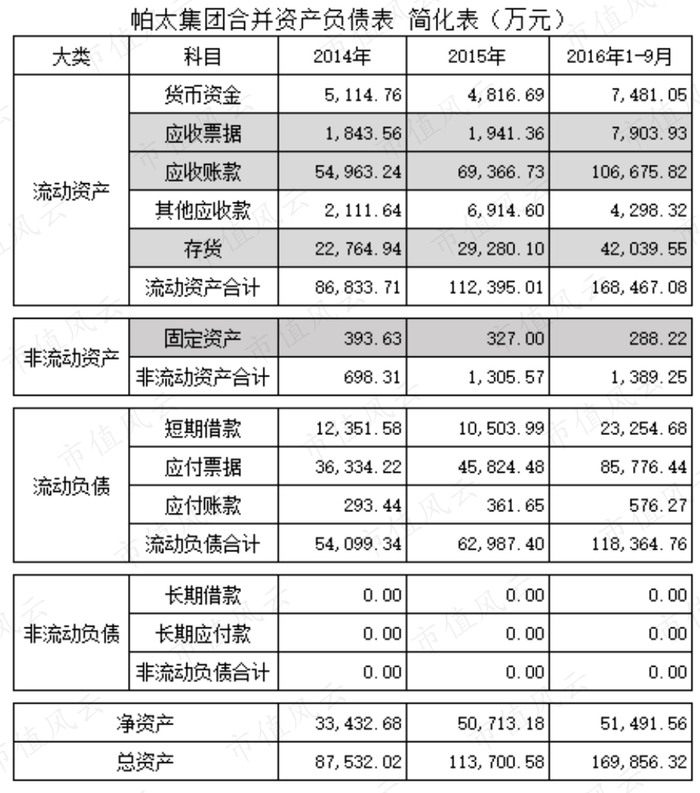 存货也是帕太集团的重要要资产,2016年前三季度,达4.2亿元,占流动资产的25%,与应收账款占比合计达88%。