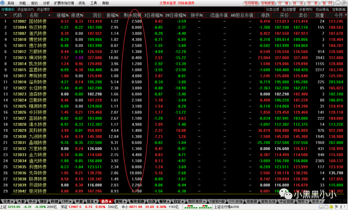 “剩余规模”是短线转债的核心。绝大多数交易软件中并没有“剩余规模”指标,或者这一指标与其它指标不在同一界面,给我们看盘带来了极大不便。