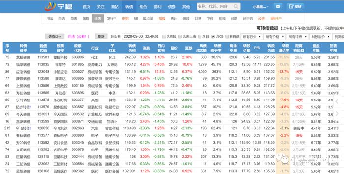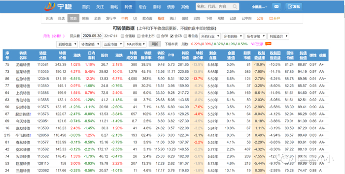 关于盘中短线观测,宁稳网有“行情简表”和“行情全表”两种模式,都可以分别以转债的价格、涨幅、溢价、剩余规模、双低情况、对应正股的涨幅等进行排序。