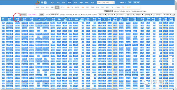 1.打开宁稳网的转债页面,选择“全表”,点击“转债代码”,将数据按转债代码排序。将全部转债数据复制到Excel。