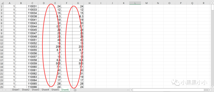 6.复制D列、E列到F列、G列。