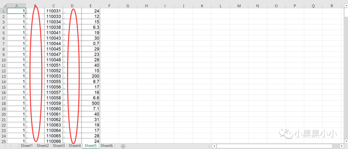 5.在B列、D列全部填入英文状态下的“,”。