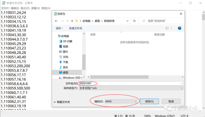 3.将文本文档另存为“20201001”(名称可以自定),注意要把编码选为ANSI。