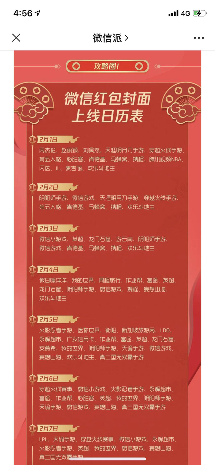 不只是奥利奥,微信官方曾发布一份红包封面上线日历表,从2月1日到2月14日天天有封面可领,参与的品牌,既有toC的零售型商家(肯德基、coco都可、必胜客等),也有网络游戏(《和平精英》、《阴阳师手游》等),甚至还有即将上映的贺岁大片(《侍神令》、《你好,李焕英》,《刺杀小说家》)。