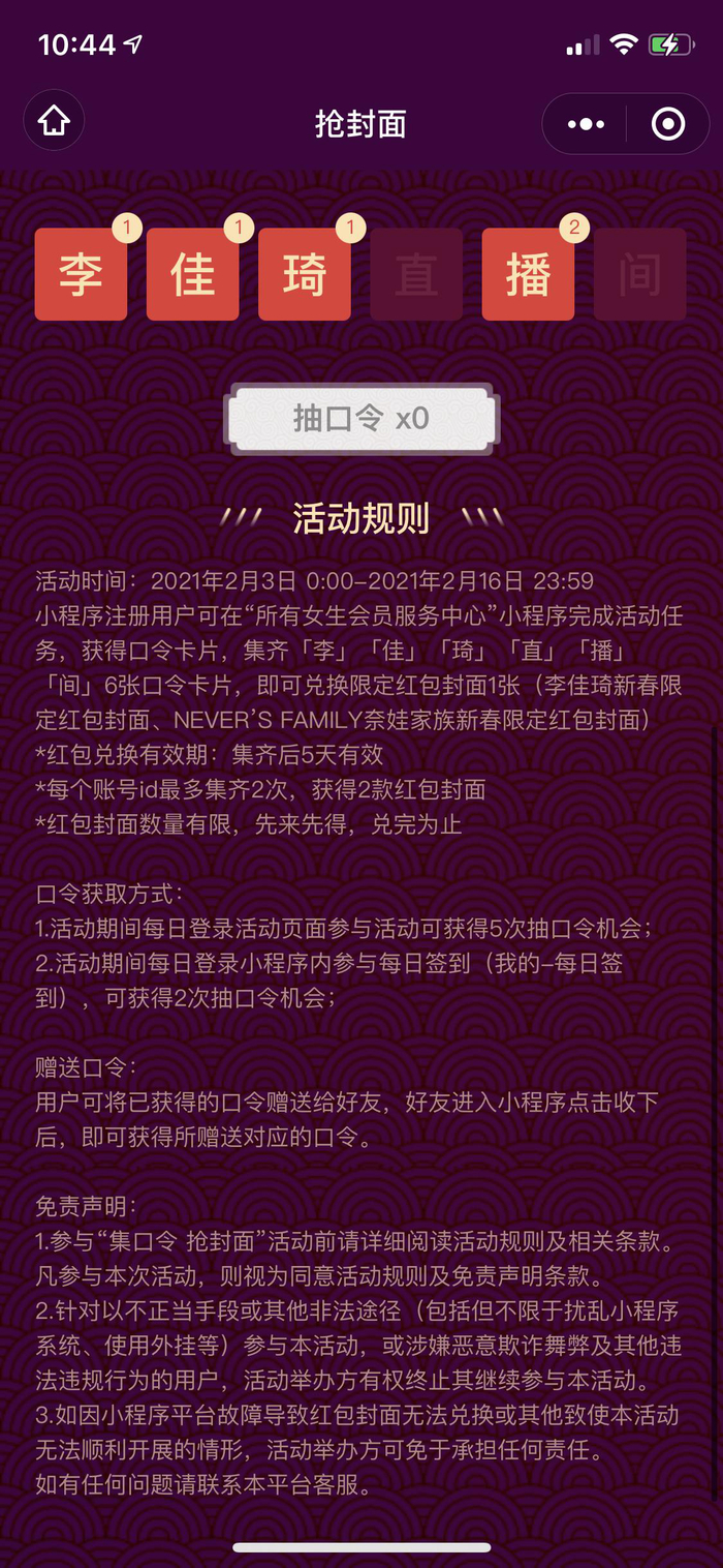 实际上,定闹钟拼手速还只是简单版,还有更为复杂的进阶版玩法。比如,李佳琦的红包封面需要通过做各种任务,集齐“李”、“佳”、“琦”、“直”、“播”、“间”6张口令卡牌,才能兑换限定红包封面1张。