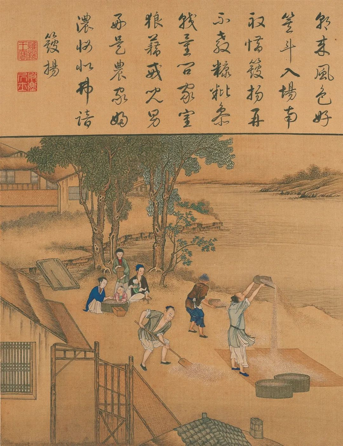 一本收藏于故宫博物院的胤禛耕织图册,生动传神,在雍正帝登基前由画师仿照康熙帝御制的耕织图册精绘而成。图册现存52页,6页为未定稿,其余46页中耕图、织图各23页,每幅画上都有胤禛的亲笔题诗,并盖有“雍亲王宝”和“破尘居士”两方印章。