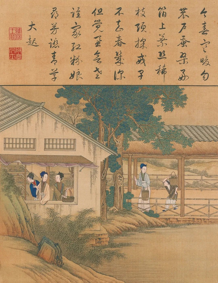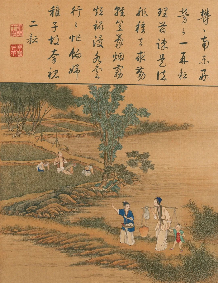 图册中,几位女子仪态端庄,或携孩童给田间劳作的胤禛送饭,或在门口等候归人,或于丰收时节在旁协助,或踏青采桑。人们其乐融融,享受着劳动过程,故宫博物院书画部研究馆员聂卉告诉记者。