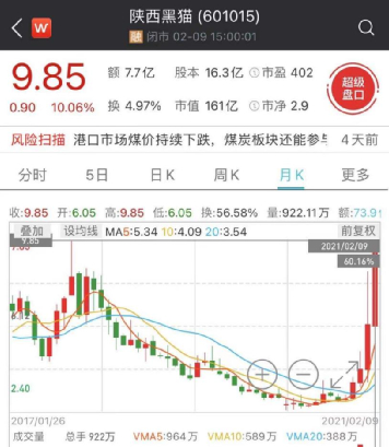昨日开盘没多久,陕西黑猫就封涨停,报9.85元/股,总市值161亿。开年迄今,陕西黑猫已“吃”13个涨停板。