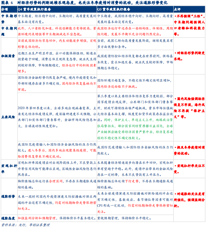 第二,对近期经济形势判断更为乐观,强调积极因素,注意国内外风险,但未提保护主义等,提及冬季疫情的扰动。Q4报告与Q3报告相比,明确提及经济内生动力逐步增强,对积极因素的判断更为乐观;对于国内外风险,国内仍强调经济恢复基础不牢,海外提及疫情防控和金融风险,但未提往期重视的“贸易保护主义”和“单边主义”,或呼应海外经济体政治环境的变化;对于国内风险,提及冬季疫情可能对消费修复所产生的扰动。