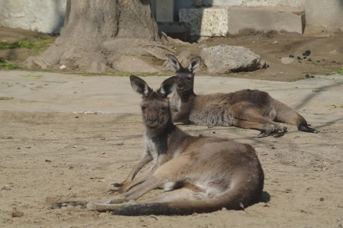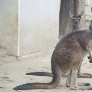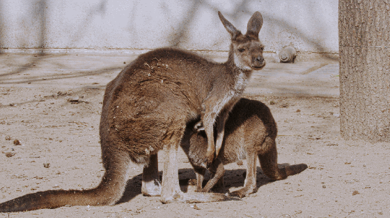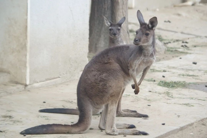 除了这只已经出袋的小灰大袋鼠,现在袋鼠展区里同时还有约6月龄的红颈袋鼠宝宝和5月龄的白袋鼠宝宝: