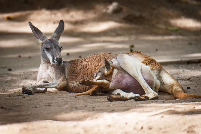 赤大袋鼠妈妈的袋袋已经撑成紫红色了