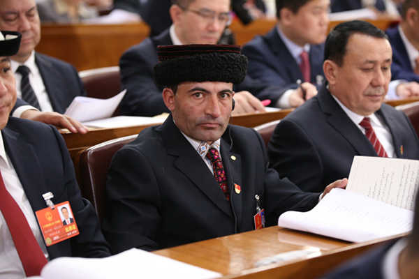 2018年3月18日,全国人大代表拉齐尼·巴依卡(塔吉克族)在北京人民大会堂出席十三届全国人大一次会议开幕会。图|新华社