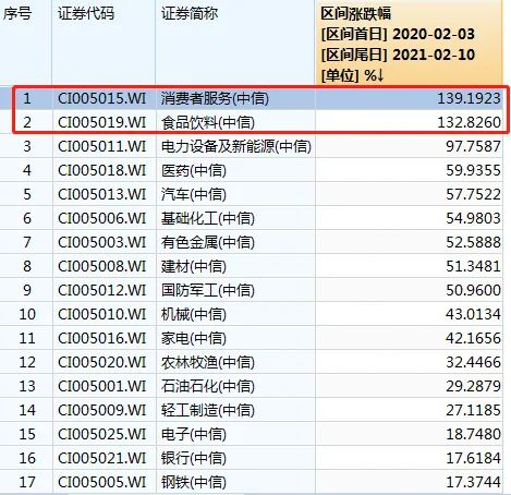 从中信一级行业指数来看,鼠年最为强势的为消费者服务和食品饮料两大板块,分别上涨139%和133%,电力设备和新能源也涨98%,医药、汽车、基础化工、有色金属、建材、国防军工等多行业涨幅超50%。