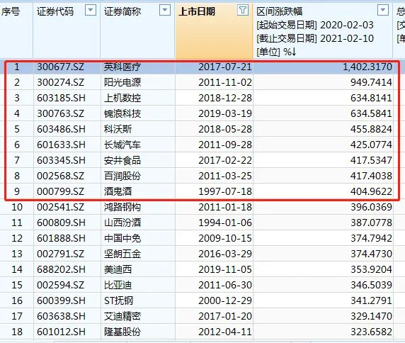 食品饮料板块,白酒股的强势有目共睹。非白酒的安井食品、百润股份涨幅都超4倍,酒鬼酒大涨405%,山西汾酒暴涨387%,最大市值的茅台也涨150%。电力设备及新能源板块的,阳光电源、锦浪科技等也涨势凶猛。