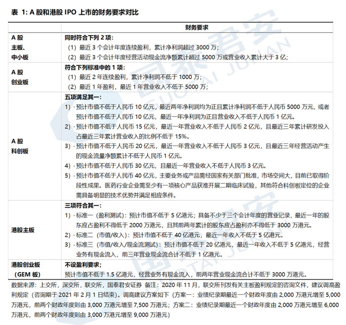 根据交易所披露的上市规则,A股主板、中小板以及创业板均要求拟上市企业实现盈利。而对拟在科创板上市的企业而言,虽然其盈利能力的要求低于主板/中小板与创业板,但是企业必须具备领先的核心技术以及市场认可度。相比之下,港股主板和创业板的财务要求更加宽松。根据联交所披露的上市规则,拟在港股主板上市的企业须符合盈利测试,市值/收入测试,或市值/收入/现金流测试三者之一。即在企业尚未盈利的情况下,如果其市值、收入和现金流满足相应要求,仍然可以在港股主板发行上市。而港股创业板财务要求更低,对拟上市企业无盈利和收入要求,只须其市值和现金流符合条件即可,使得一些盈利能力不足且业务前景较差的企业也能在港股寻求上市。