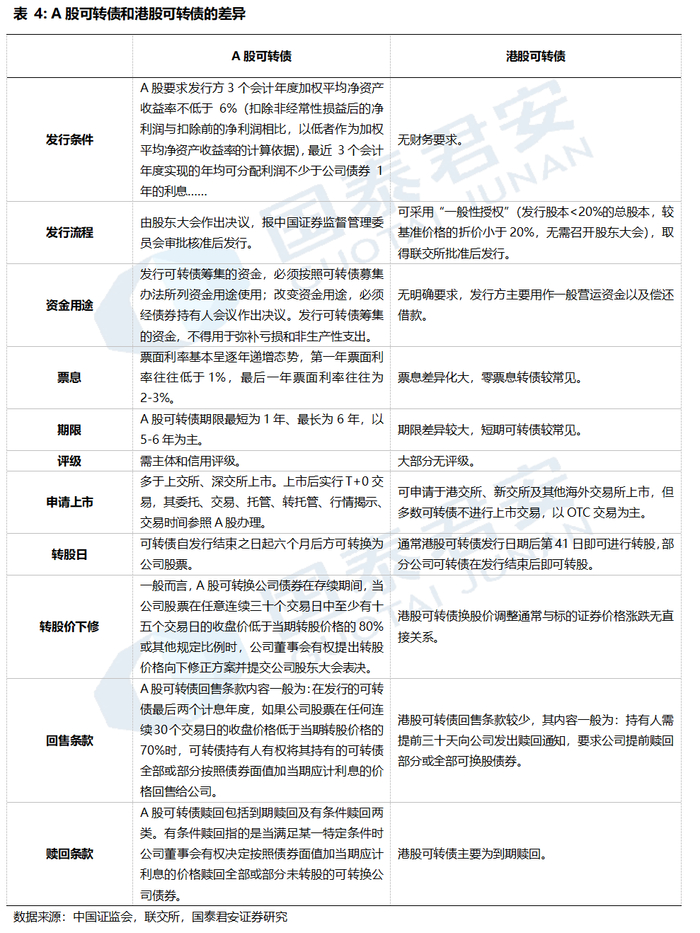 3)港股可转债转股更快。通常港股可转债发行日期后第41日即可进行转股,部分公司可转债在发行结束后即可转股,而A股可转债转股日一般为可转债发行结束之日满六个月后的第一个交易日。
