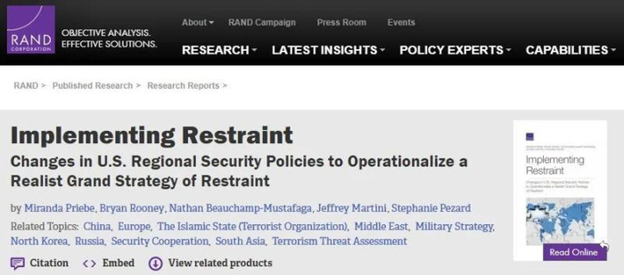 前述自媒体提到的兰德公司报告题为《实施克制——美国地区安全政策的变化,走向实施现实主义的克制大战略》(下简称《克制战略》),为兰德公司今年1月21日发布的长篇报告,报告中文译文约12万字。