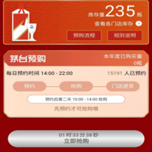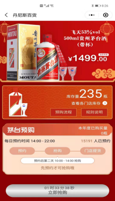 农历大年三十上午10时前夕,丹尼斯小程序显示当日预约抢购人数已达15191人,而库存总量仅为235瓶。